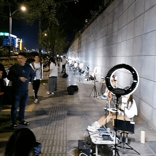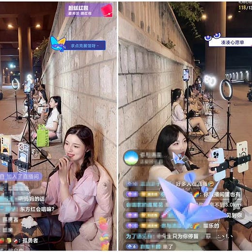 Colocadas en fila y con los flexos circulares sobre sus cabezas a modo de aureolas, o nimbos, parece un callejón lleno de ángeles. No estoy seguro de si lo hacen por acercarse a los ricos, porque buscando la historia en los medios chinos (con el traductor, ojo) leo que las chicas quedaron para transmitir juntas en la ciudad de Guilin y formar una "calle de celebridades de Internet".